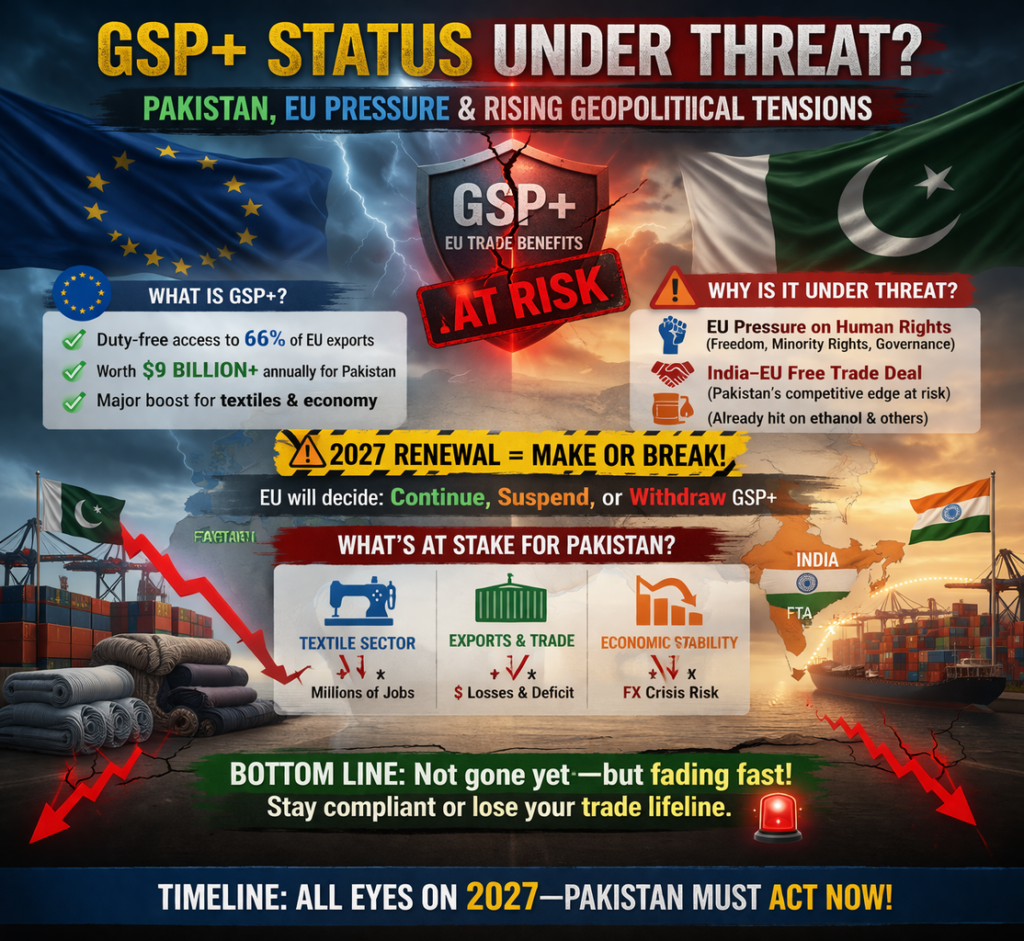 Pakistan’s GSP+ (Generalised Scheme of Preferences Plus) status—granted by the European Union—is reportedly facing serious risk as the current cycle